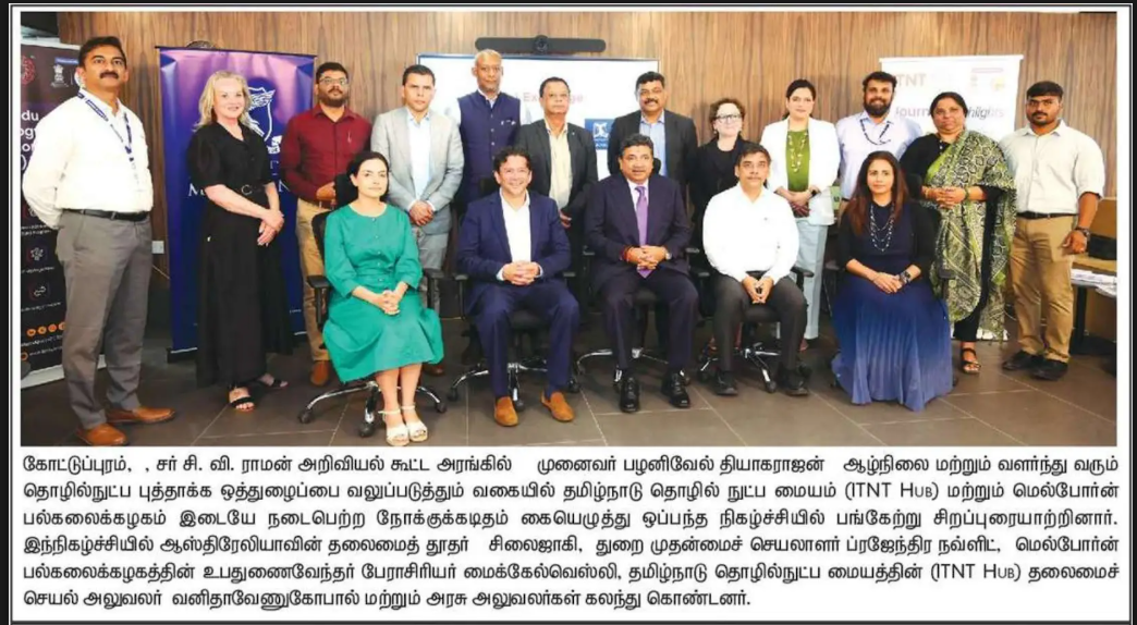 சென்னை அண்ணா பல்கலைக்கழக வளாகத்தில் ஆஸ்திரேலியா மெல்போர்ன் பல்கலைக்கழகத்துடன் ஆன புரிந்துணர்வு ஒப்பந்தத்தில் கையெழுத்திடும் நிகழ்ச்சி நேற்று நடந்தது. இந்த நிகழ்வில் தமிழ்நாடு தகவல் தொழில்நுட்பத் துறை மற்றும் டிஜிட்டல் சேவைகள் துறை அமைச்சர் பழனிவேல் தியாகராஜன், ஆஸ்திரேலியாவின் தலைமை தூதர் சிலைஜாகி, தமிழ்நாட்டு தகவல் தொழில்நுட்பத்துறையின் முதன்மை செயலாளர் ப்ரஜேந்திர நவ்நீத் மற்றும் அதிகாரிகள் கலந்து கொண்டனர்.