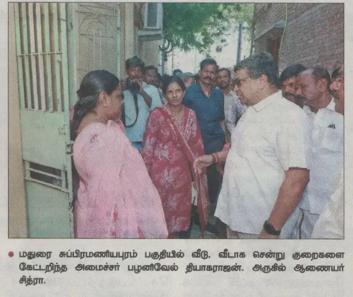 மதுரை மத்திய தொகுதியில் அமைச்சர் பழனிவேல் தியாகராஜன் மாநகராட்சி அதிகாரிகளுடன் வீடு வீடாக சென்று பொதுமக்கள் குறைகளை கேட்டறிந்தார்.